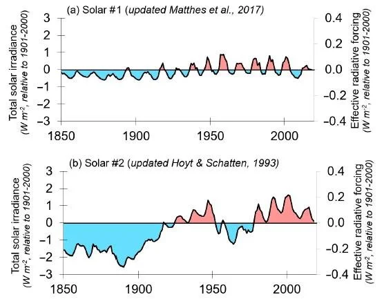 O gráfico superior (Solar #1) é o conjunto de dados da ETI subjacente à narrativa de que as alterações climáticas resultam, em grande parte, das emissões humanas de gases com efeito de estufa, e foi utilizado pelo IPCC (Painel Intergovernamental sobre Alterações Climáticas) no seu AR6 (Sexto Relatório de Avaliação) de 2021. O gráfico inferior (Solar #2) é um conjunto de dados TSI de uma série de satélites diferente, e exibe uma tendência mais complicada desde 1950 do que o Solar #1.