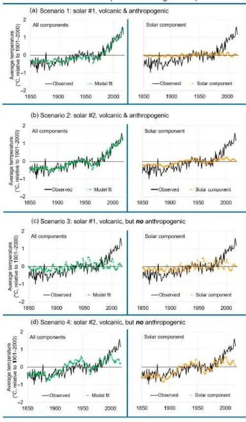 A análise dos investigadores revela que, se a série temporal do Solar #1 TSI for válida, tal como assumido pelo IPCC no AR6, então as forças naturais (solares e vulcânicas) podem explicar, no máximo, apenas 21% do aquecimento observado de 1850 a 2018 (Cenário 3). Nesta imagem, a adição de forças antropogénicas eleva esse número para um ajuste de 87% (Cenário 1).