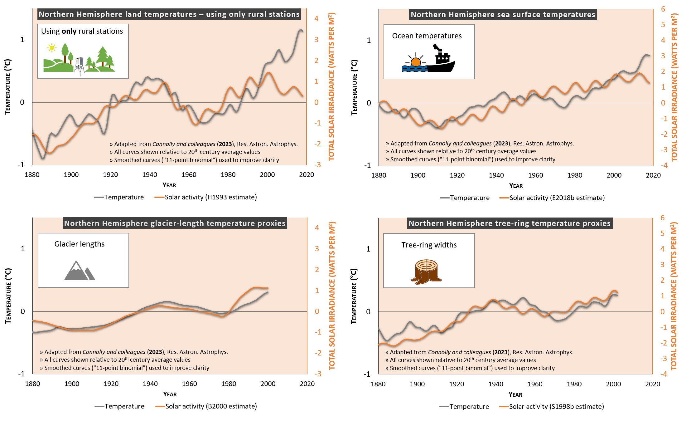 Várias destas diferentes estimativas da actividade solar sugerem que a maior parte do aquecimento observado fora das zonas urbanas (nas zonas rurais, nos oceanos e nos glaciares) pode ser explicado à luz da actividade solar. Algumas estimativas sugerem que o aquecimento global é uma mistura de factores humanos e naturais. Outras estimativas concordam com as conclusões do IPCC.