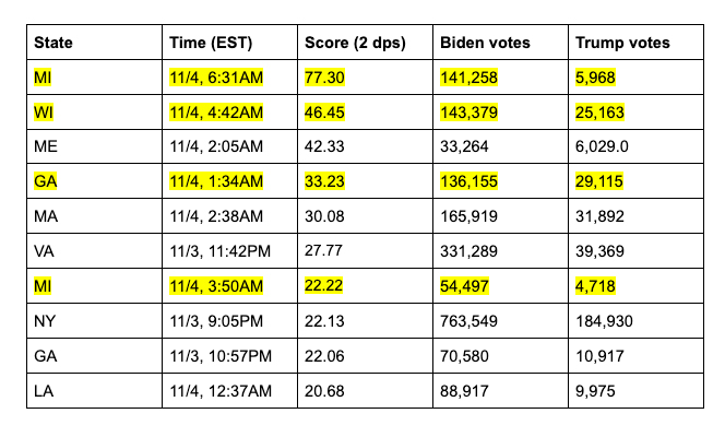 E nunca ninguém chegou a explicar o que é que aconteceu na madrugada em estados chave como os de Georgia, Michigan, Pensilvânia e Wisconsin, quando os votos pararam subitamente de ser contados, numa altura em que Trump liderava confortavelmente, para umas horas depois a contagem ser reiniciada com Biden a ganhar subitamente vantagem (dois primeiros gráficos) e a receber, também de repente, uma esmagadora proporção de votos, que até aí não se tinha registado de todo (último gráfico).